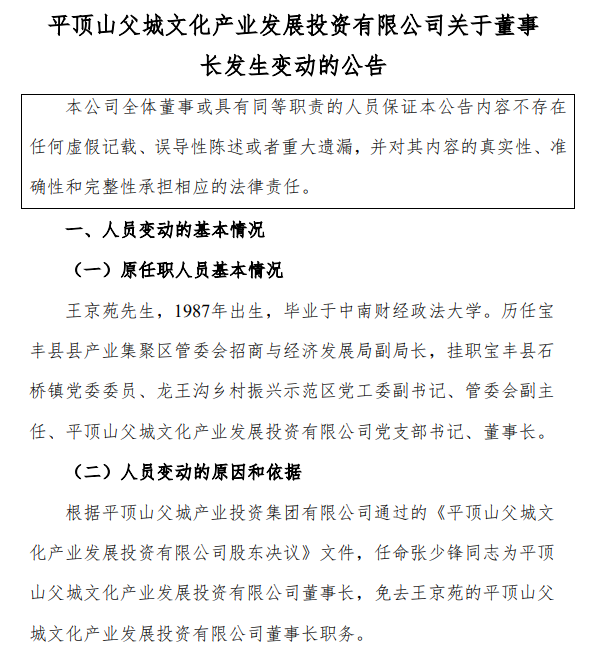 【大河财立方消息】3月5日,平顶山父城文化产业发展投资有限公司发布公告称,根据相关文件,任命张少锋为公司董事长,免去王京苑的董事长职务。