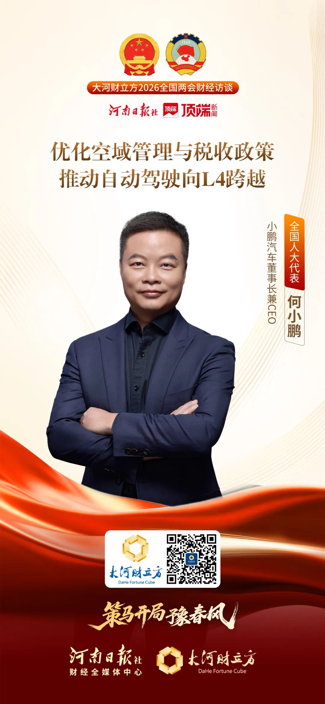 2026全国两会召开之际,全国人大代表、小鹏汽车董事长兼CEO何小鹏在接受大河财立方记者采访时表示,今年两会他围绕科技创新与产业升级的核心方向,聚焦如何以产业端的实际需求为出发点,为未来产业的规模化落地提出具体的制度创新与政策支持方向,助力科创成果从实验室走向实际应用场景。