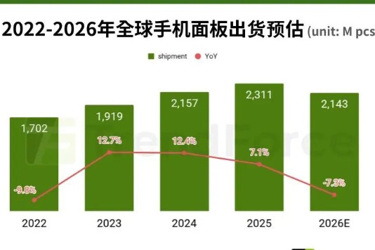 根据TrendForce集邦咨询最新手机面板调查,由于占手机成本极高的存储器缺货与价格攀升,冲击了品牌对2026年的出货规划,更削弱面板出货动能。预估2026年全球手机面板出货量约为21.4亿片,较2025年23.1亿片下滑约7.3%,结束了自2023年以来的成长周期,首度转为年减态势。