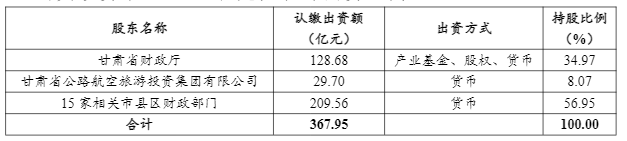 增资完成后,原股东甘肃省财政厅出资形成的实收资本128.68亿元,出资比例变为34.97%;甘肃省公航旅集团出资形成的实收资本29.7亿元,出资比例变为8.07%。15家相关市县区财政部门出资形成的实收资本209.56亿元,合计出资比例56.95%。