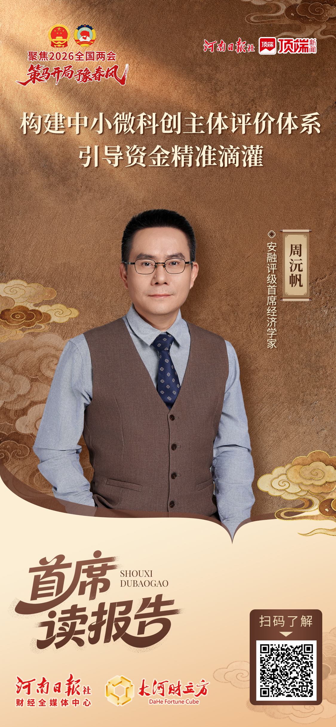 【大河财立方 记者 张克瑶】3月5日上午,十四届全国人大四次会议举行开幕会,政府工作报告提请审议。针对2026年政府工作任务,政府工作报告提出,“推动科技创新和产业创新深度融合”“加强科技创新全链条全生命周期金融服务”。围绕信用评级体系如何支持科技创新,安融评级首席经济学家周沅帆接受大河财立方记者专访。