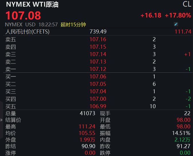 【大河财立方消息】由于美以与伊朗的冲突不断扩大引发供应担忧,3月9日,亚市盘初,国际原油价格直线暴涨,自2022年俄乌冲突爆发以来首次突破每桶100美元。截至发稿,布伦特原油、WTI原油双双突破111美元/桶,盘中分别最高涨19.80%、22.11%。
