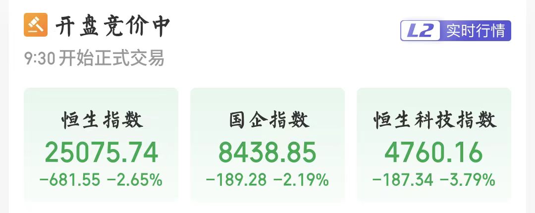 【大河财立方消息】3月9日,港股恒生指数低开2.65%,恒生科技指数跌3.79%,国企指数跌2.19%。