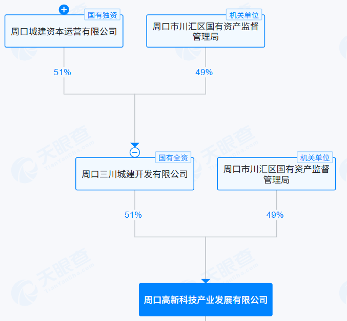 天眼查显示,周口高新科技产业发展有限公司成立于2019年,注册资本金5亿元。股权结构方面,周口三川城建开发有限公司持股51%,周口市川汇区国有资产监督管理局持股49%。其中,周口三川城建开发有限公司为周口城建资本运营有限公司控股子公司。