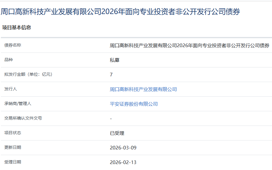 【大河财立方消息】3月9日,周口高新科技产业发展有限公司2026年面向专业投资者非公开发行公司债券获上交所受理。该债券拟发行金额7亿元,承销商/管理人为平安证券。