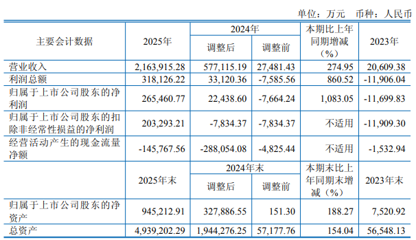 2025年*ST松发实现营业收入216.39亿元,同比增长274.95%;归属于上市公司股东的净利润26.55亿元,同比增长1083.05%。