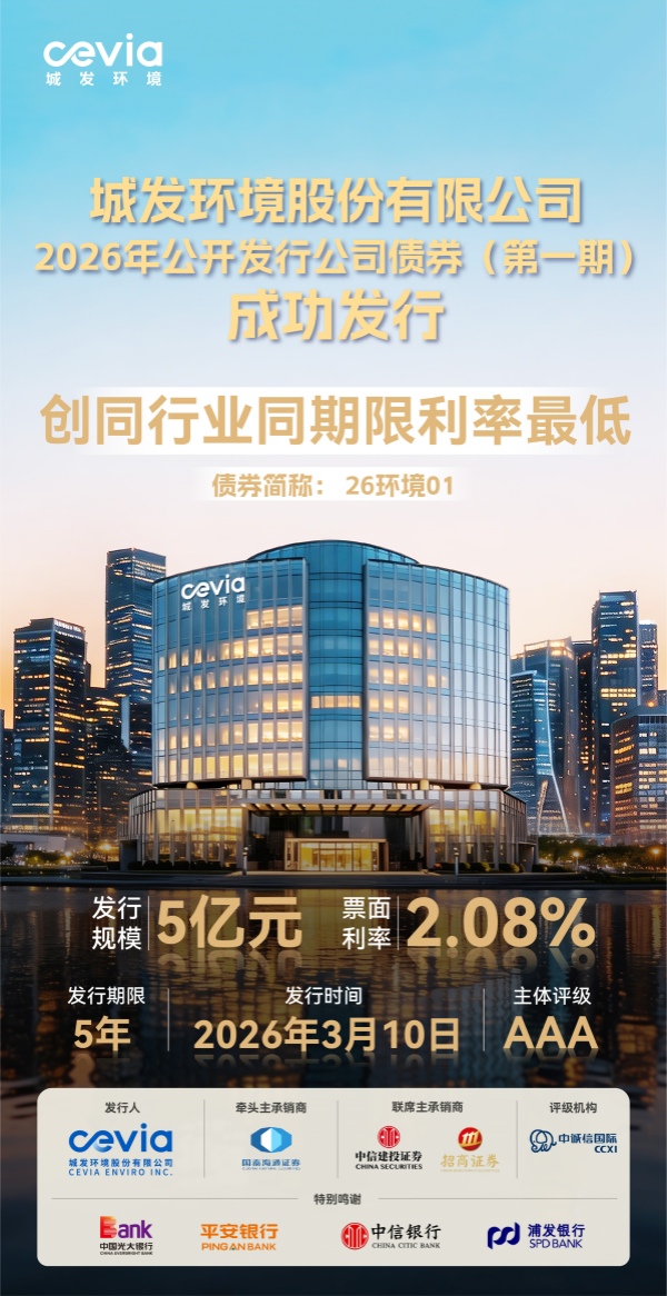 【大河财立方 记者 吴春波】3月11日,大河财立方记者获悉,城发环境股份有限公司(股票代码:000885.SZ)已于3月10日圆满完成2026年度第一期小公募公司债券簿记发行工作。本期债券发行规模5亿元,期限5年,最终票面利率2.08%,创下2026年以来全国环保行业同期限公司债、河南省同期限公司债发行利率双项最低纪录。本期债券牵头主承销商及簿记管理人为国泰海通证券,中信建投证券、招商证券担任联席主承销商。