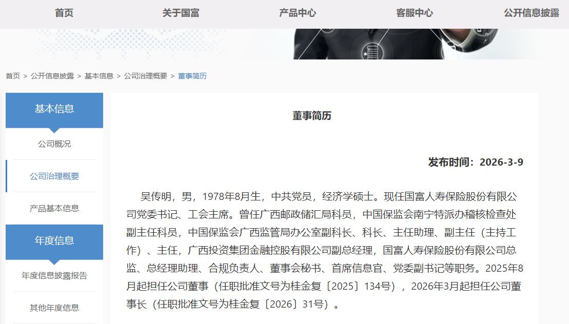 近日,国富人寿官网披露重大事项临时信息显示,根据公司第三届董事会第十六次会议决议,并经国家金融监督管理总局广西监管局核准(桂金复〔2026〕31号),吴传明正式担任国富人寿第三届董事会董事长,任期自公司任命之日起至本届董事会任期届满止。