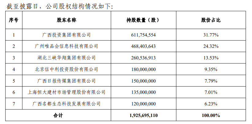 其余股东包括湖北三峡华翔集团(13.53%)、北京信中利(9.35%)、广西日报传媒集团(7.79%)、上海恒大建材(7.01%)及广西名都生态科技(6.23%),整体呈现地方国资、互联网企业、投资机构及产业集团多元持股格局。