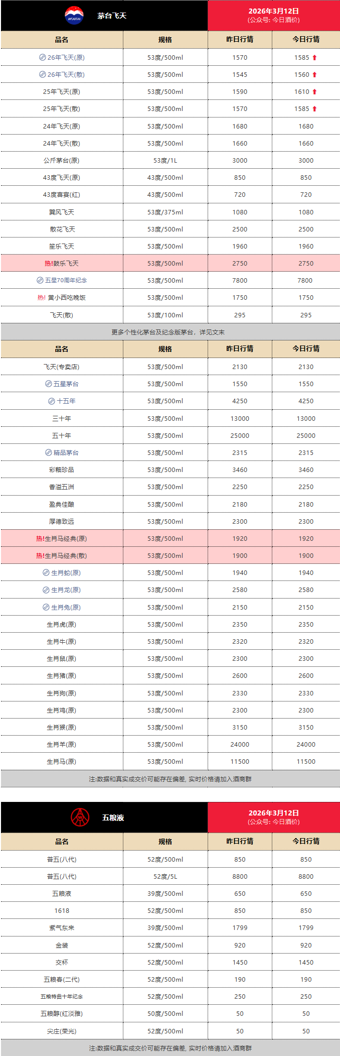 【大河财立方消息】3月12日,“今日酒价”披露的批发参考价显示,2026、2025年产飞天茅台全线上涨。
