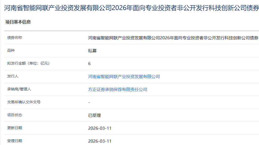 【大河财立方消息】3月12日消息,河南省智能网联产业投资发展有限公司2026年面向专业投资者非公开发行科技创新公司债券项目获上交所受理。