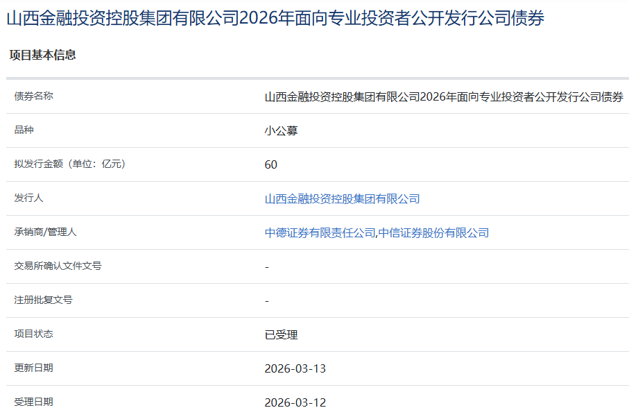 【大河财立方消息】3月13日,山西金融投资控股集团有限公司2026年面向专业投资者公开发行公司债券项目获上交所受理。本期债券拟发行金额60亿元,承销商/管理人为中德证券、中信证券。