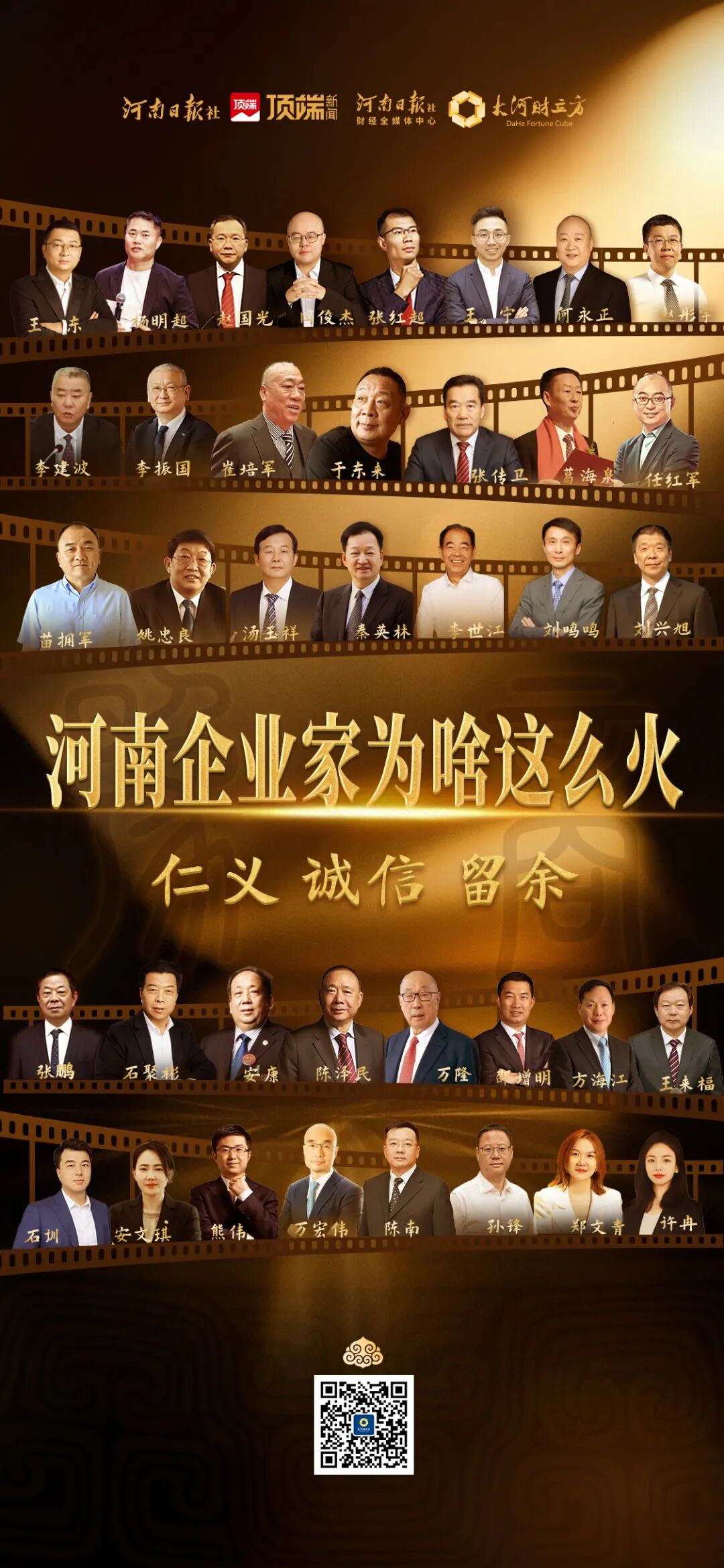 一张张熟悉的面孔,一个个鲜活的名字,背后是一代代豫商脚踏实地、奋勇拼搏的足迹。“仁义、诚信、留余”六个大字,以厚重有力的字体呈现在海报中央,与企业家们的身影交相辉映,在夜色中格外醒目,诉说着千年豫商的精神传承与时代担当。