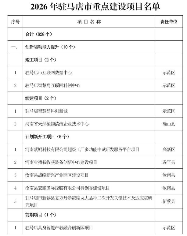 【大河财立方消息】3月13日,驻马店市发展改革委印发2026年市重点建设项目名单,共单列谋划实施项目828个,总投资2890.8亿元,年度计划投资1386.3亿元。