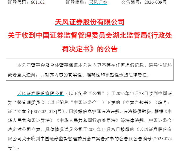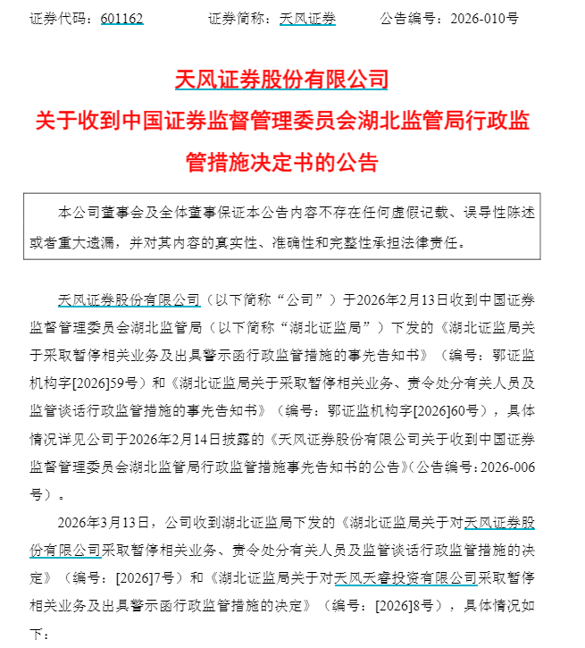 此外,天风证券同日公告,收到湖北证监局下发的行政监管措施决定书。