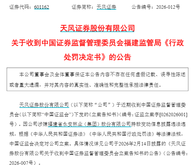 福建证监局认为,天风证券未及时披露永安林业持股变动信息行为,违反了相关规定。福建证监局决定,对天风证券责令改正,给予警告,并处以400万元罚款;对王琳晶给予警告,并处以140万元罚款。