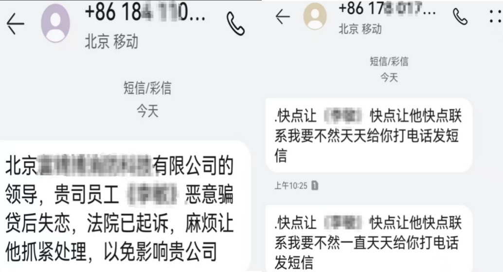 据张晓飞提供的短信截图,催收公司频繁向其新就职公司的同事发送信息,内容涉及公司名称、当事人个人信息,并称当事人“恶意骗贷”。