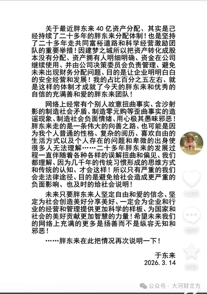 【大河财立方 记者 司高妍】3月14日,胖东来创始人于东来在社交平台再次发文,对胖东来40亿元资产分配再做说明。