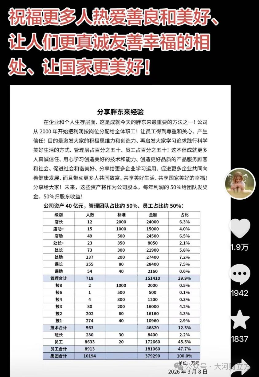 3月8日,胖东来创始人于东来在社交平台发文分享经验,公布公司40亿元资产利润的分配标准:管理团队占比约50%,员工占比约50%。