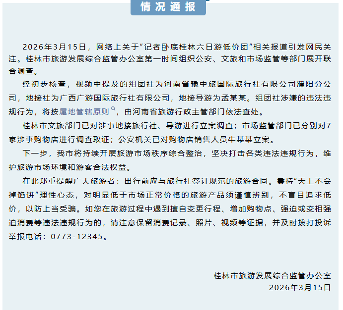 3月15日,网络上关于“记者卧底桂林六日游低价团”相关报道引发网民关注。桂林市旅游发展综合监管办公室第一时间组织公安、文旅和市场监管等部门展开联合调查。