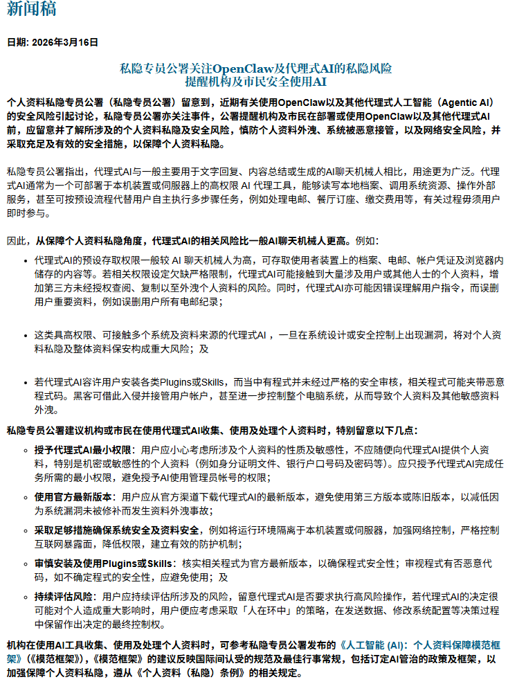 【大河财立方消息】3月16日,香港个人资料私隐专员公署发文称,近期留意到有关使用OpenClaw以及其他代理式人工智能(Agentic AI)的安全风险引起讨论。