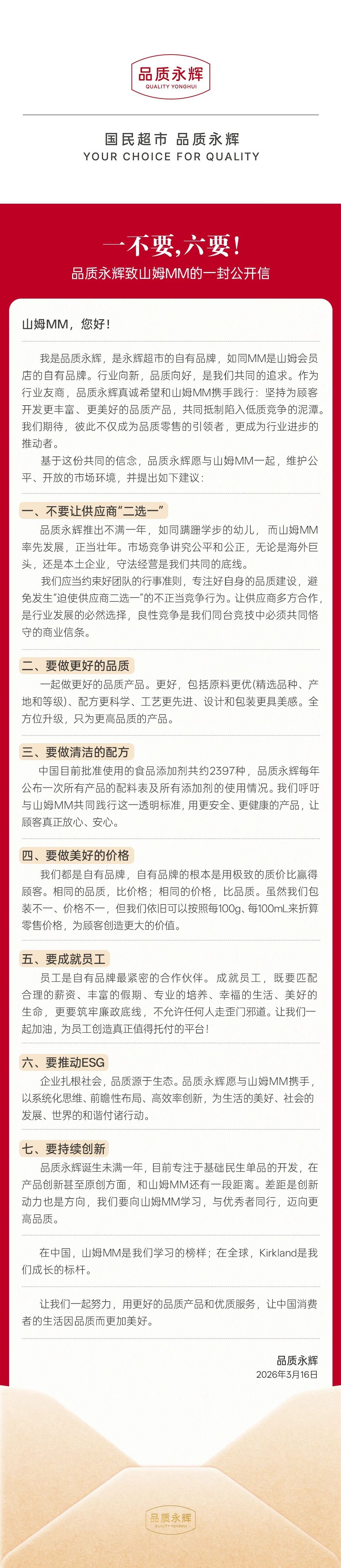 【大河财立方 记者 司高妍】3月16日,永辉超市自有品牌“品质永辉”发布致山姆MM的一封公开信。