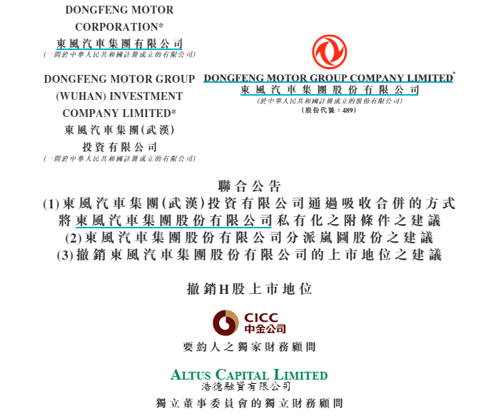 【大河财立方消息】3月18日早间,东风集团股份在港交所公告,已获联交所批准,自3月18日下午四时正起正式撤销H股于联交所的上市地位。此举为要约人东风汽车集团(武汉)投资有限公司通过吸收合并方式私有化公司的关键步骤,合并条件已达成或获豁免,公司上市地位终止。