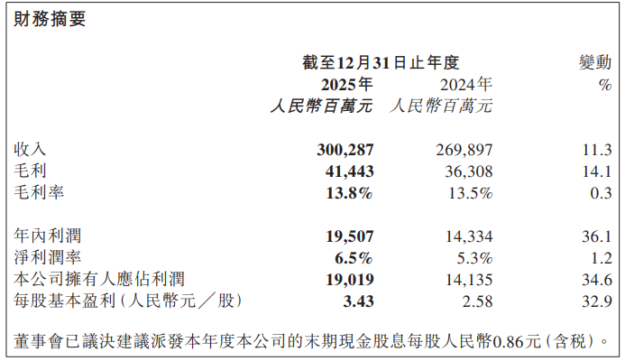 【大河财立方消息】3月18日,奇瑞汽车公告,2025年收入3002.87亿元,同比增长11.3%;年内利润195.07亿元,同比增长36.1%;净利润率6.5%,上年同期5.3%。公司拥有人应占利润190.19亿元,同比增长34.6%。毛利率由上一年的13.5%增长至本年度的13.8%。董事会已议决建议派发本年度本公司的末期现金股息每股人民币0.86元(含税)。