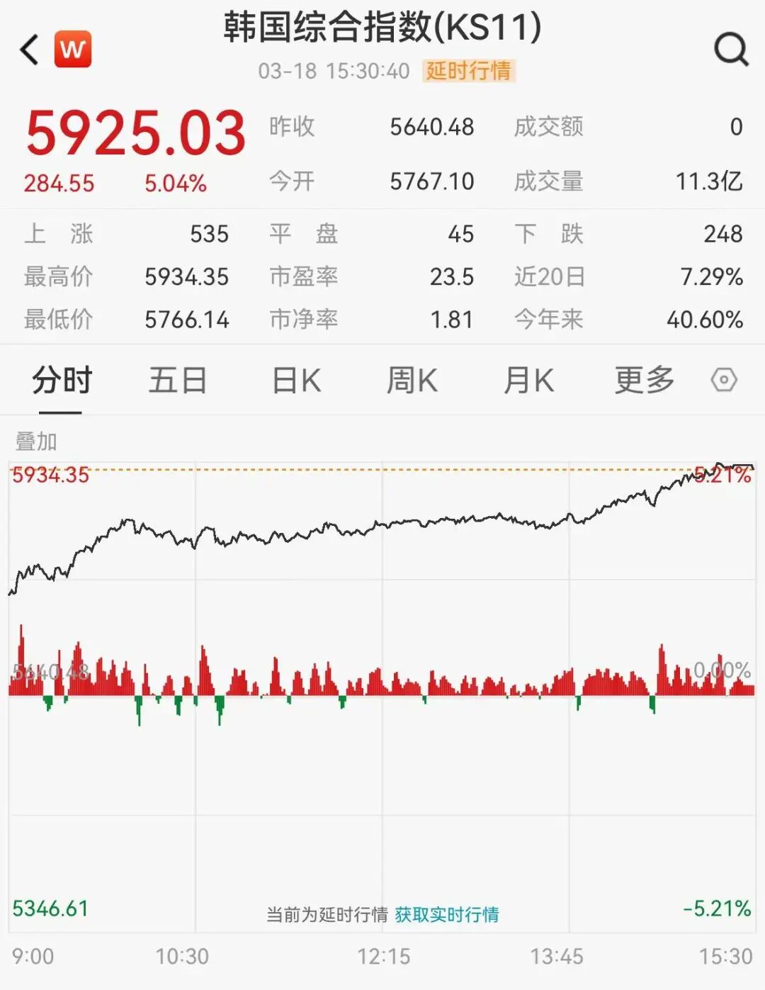 韩国股市爆发,韩国综合指数收盘涨5.04%报5925.03点,权重股方面,SK海力士涨8.87%,三星生命涨8.29%,三星电子涨7.53%。其中韩国交易所于KOSPI 200期货上涨5%后启动KOSPI指数熔断机制,程序化交易暂停5分钟。
