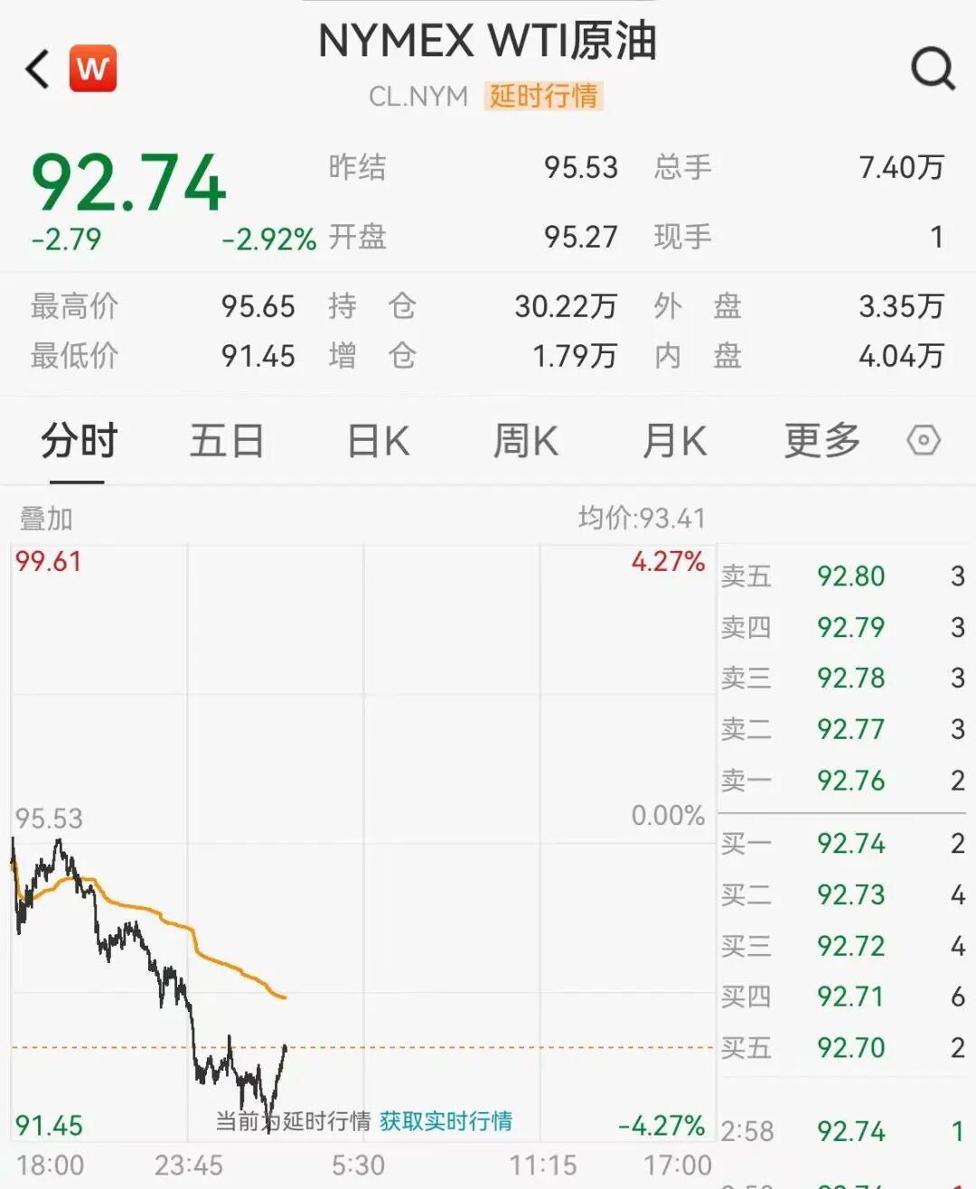 国际石油价格涨势放缓,WTI原油价格盘中跌超4%,ICE布油盘中走低跌超2%。