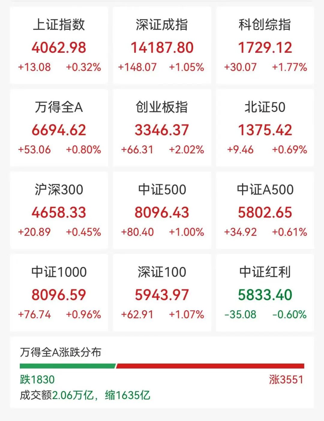 A股市场午后震荡拉升。截至收盘,上证指数涨0.32%,深证成指涨1.05%,创业板指涨2.02%,科创综指涨1.77%。板块方面,算力租赁股持续走强,数据港直线涨停,平治信息封20cm涨停;存储芯片板块全天强势,同有科技、深科达、西测测试、朗科科技20cm涨停,佰维存储续创历史新高。油气开采及服务、白酒、转基因板块跌幅居前。上涨个股超3500只。