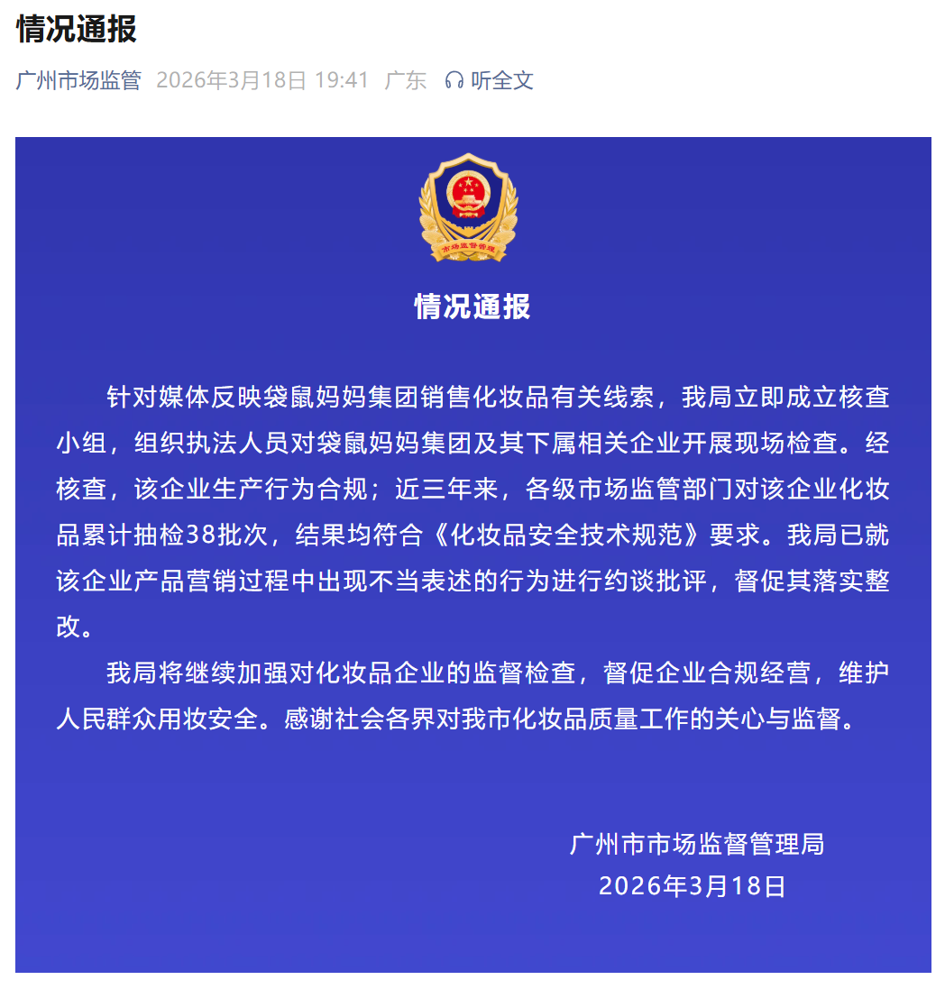经核查,该企业生产行为合规;近三年来,各级市场监管部门对该企业化妆品累计抽检38批次,结果均符合《化妆品安全技术规范》要求。广州市市场监督管理局已就该企业产品营销过程中出现不当表述的行为进行约谈批评,督促其落实整改。