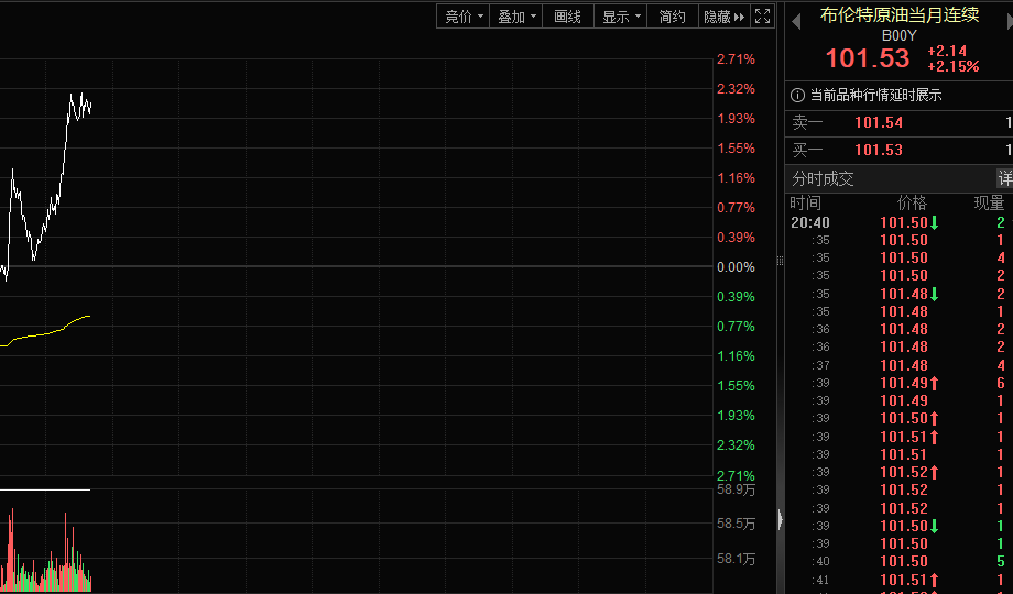 【大河财立方消息】北京时间3月18日晚间,布伦特原油直线拉升。截至发稿,布油当月连续涨超2%,报101.53美元/桶。