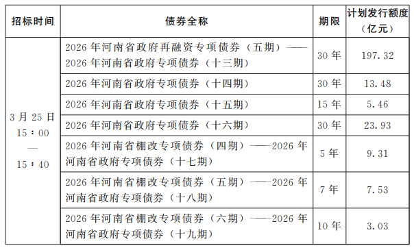 【大河财立方消息】3月18日,河南省财政厅披露,2026年河南省政府专项债券(十四至十九期)、再融资专项债券(五期)拟发行总额为260.06亿元,品种为记账式固定利率附息债券。3月25日招标 ,3月26日开始计息。