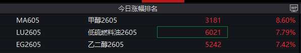 【大河财立方消息】3月18日晚间,甲醇主力期货、低硫燃料油主力期货、乙二醇主力期货集体大涨,涨幅分别达8.60%、7.79%、7.42%。