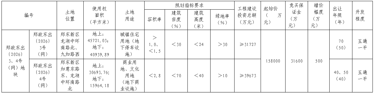 郑政东出〔2026〕3号(网)地块位于郑东新区龙湖中环南路北、九如路西,地上使用权面积45721.03平方米(约68.58亩),为城镇住宅用地,要求1.0<容积率<1.5,建筑高度不超过24米,出让年限70年,工程建设投资总额不低于3.17亿元。