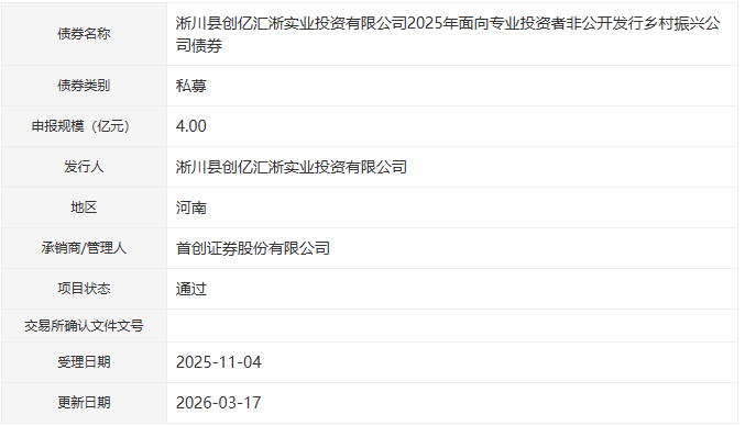 【大河财立方消息】3月19日消息,淅川县创亿汇淅实业投资有限公司2025年面向专业投资者非公开发行乡村振兴公司债券项目获深交所通过。债券申报规模4亿元,承销商/管理人为首创证券。