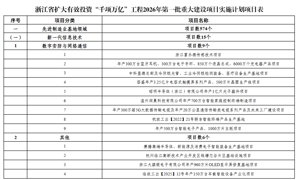全名单:浙江省扩大有效投资“千项万亿”工程2026年第一批重大建设项目实施计划项目表
