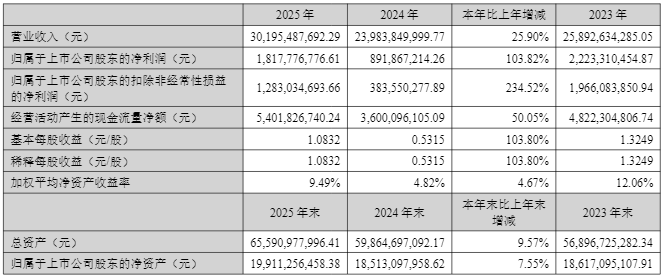 公告显示,中材科技2025年实现营业收入301.95亿元,同比增长26%;归属于上市公司股东的净利润18.18亿元,同比增长103.82%。