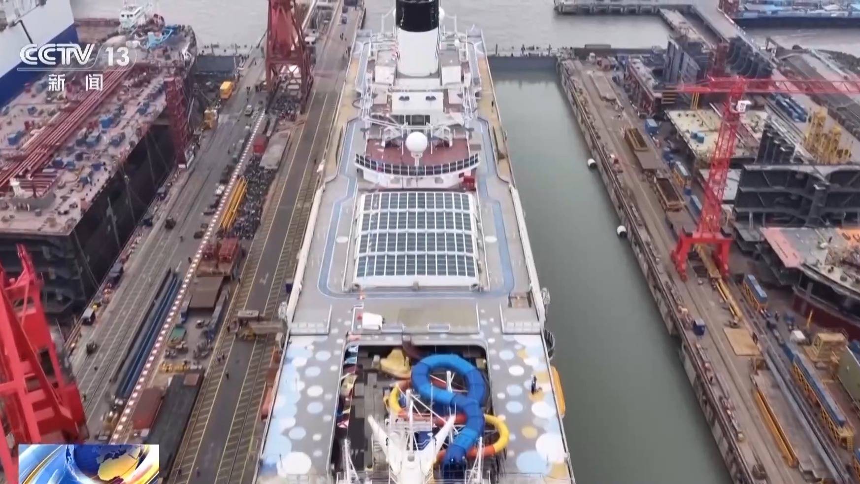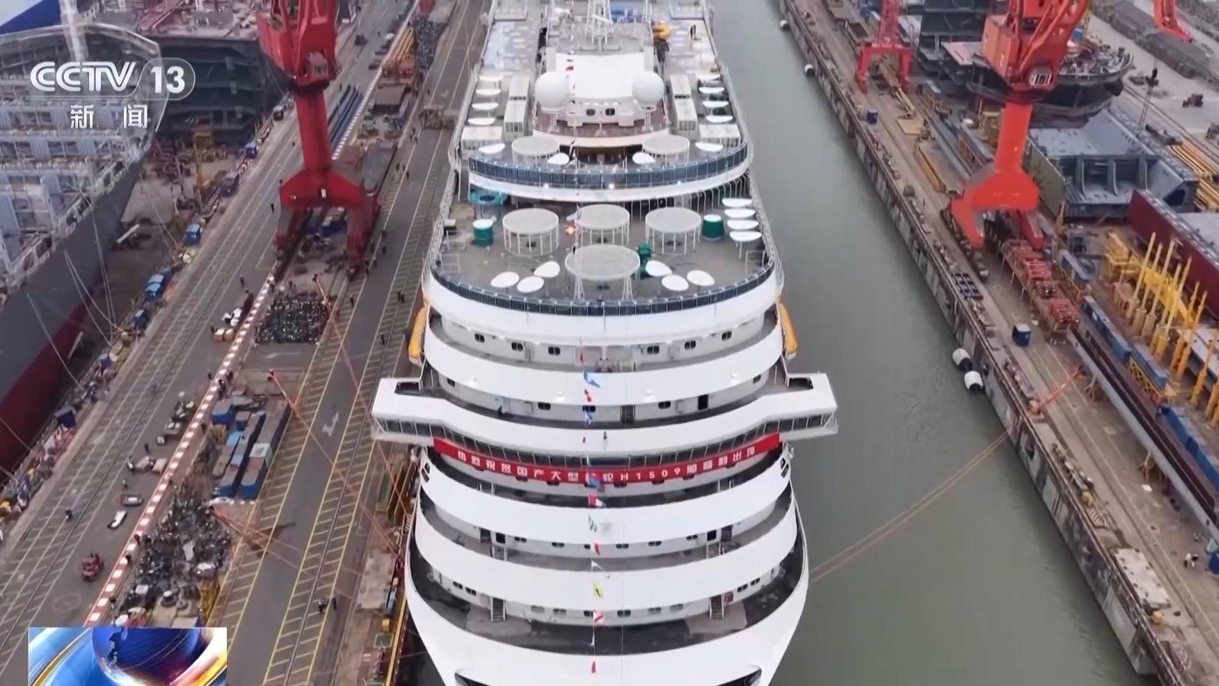 中船集团外高桥造船邮轮项目部副部长 张强:出坞时间点的选择,其实最主要的因素还是根据潮水。选择最高潮位,而且是一个平潮位,潮水不再变化了,这个时候水流是最稳定的,确保整个船的安全。
