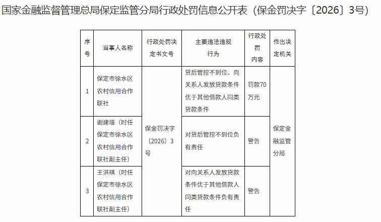 时任保定市徐水区农村信用合作联社副主任谢建增因对贷后管控不到位负有责任,受到警告处罚;时任保定市徐水区农村信用合作联社副主任王洪祺因对向关系人发放贷款条件优于其他借款人同类贷款条件负有责任,受到警告处罚。