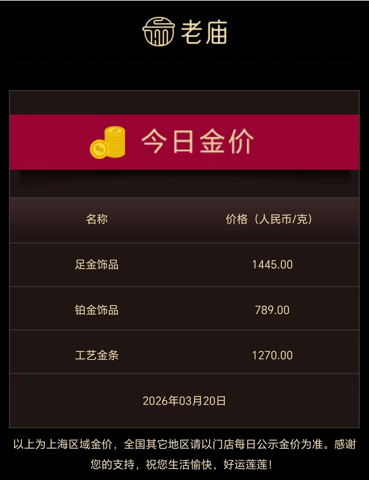 其中,周生生足金饰品价格跌至1443元/克,较前一日跌49元,两日累计跌104元;老庙黄金足金饰品价格跌至1445元/克,较前一日跌53元,两日累计跌105元;老凤祥足金饰品价格为1443元/克,较前一日跌55元,两日累计跌97元;周大福足金饰品报1447元/克,较前一日跌56元,两日累计跌98元。