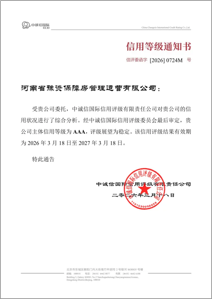 【大河财立方消息】3月18日,河南省豫资保障房管理运营有限公司(简称豫资保障房公司)经中诚信国际信用评级有限责任公司综合评定,主体信用等级获评AAA最高等级,评级展望为稳定。至此,豫资保障房公司已顺利通过国内三家主流评级机构的AAA主体信用认证,标志着公司综合实力与资本市场认可度稳居同行业第一梯队。