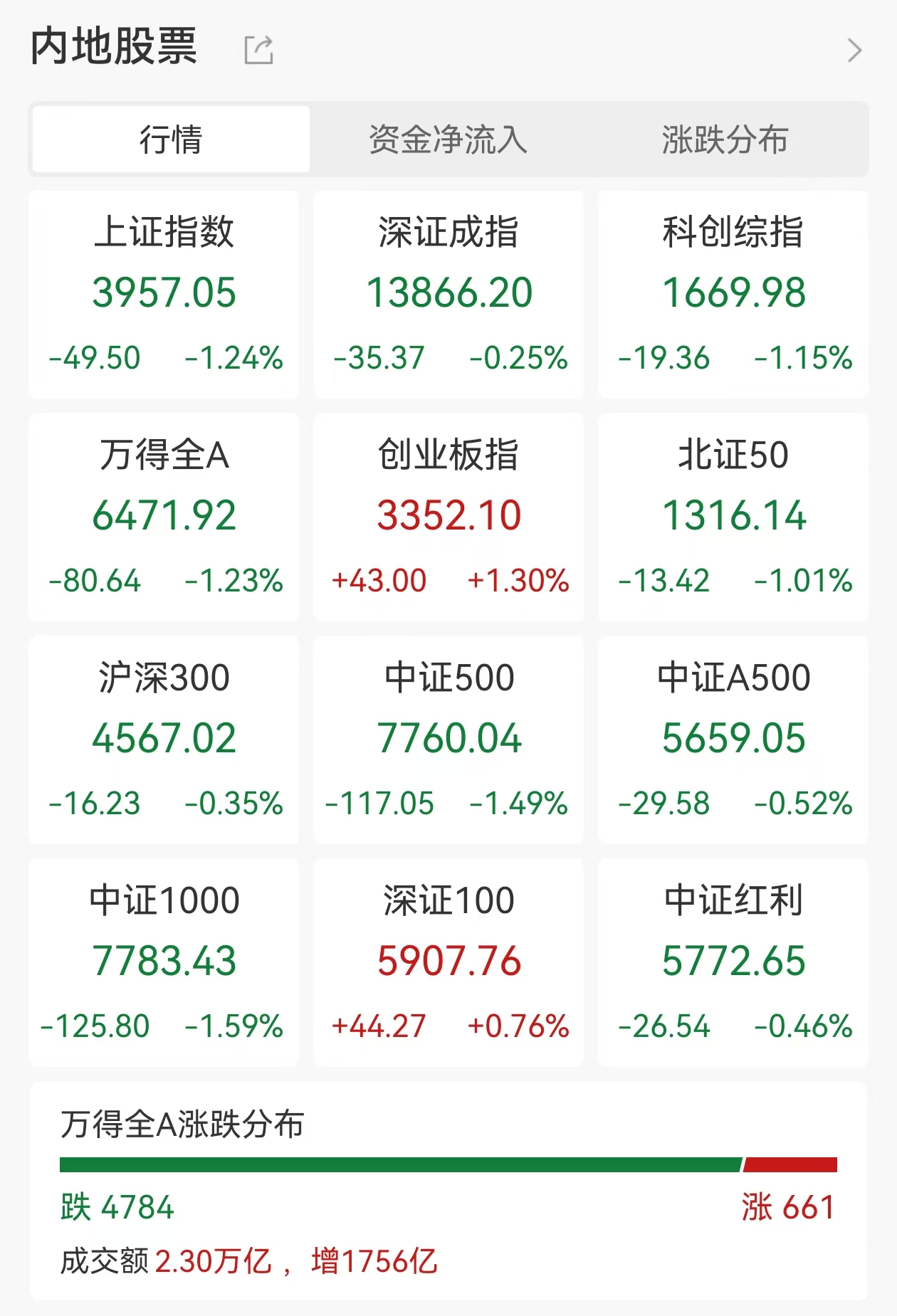 全市成交额2.3万亿元,较前一交易日增量1756亿元,近4800只个股下跌。