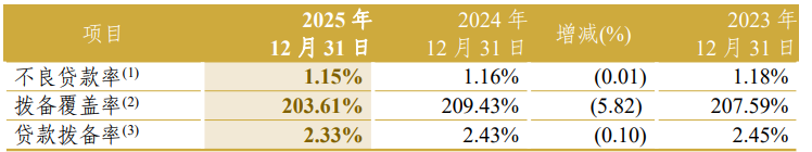 资产质量方面,截至2025年末,中信银行不良贷款余额672.16亿元,比上年末增加7.31亿元,增长1.10%;不良贷款率1.15%,比上年末下降0.01个百分点;拨备覆盖率203.61%,比上年末下降5.82个百分点。