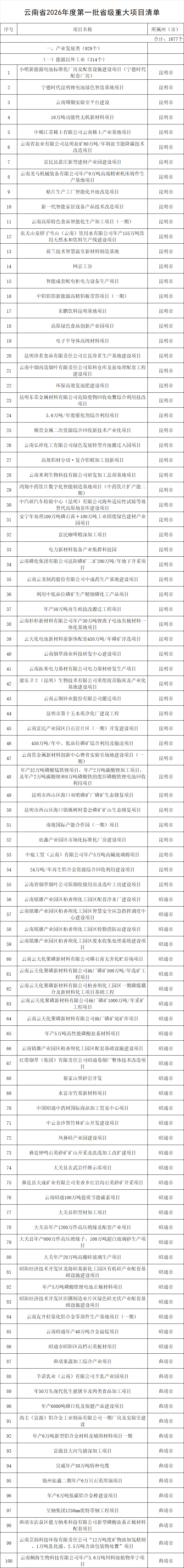 附:云南省2026年度第一批省级重大项目部分清单