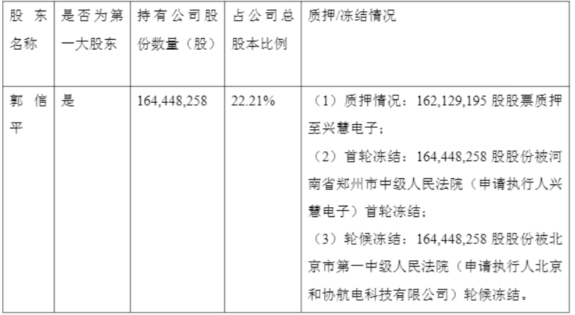 值得注意的是,郭信平持有的股份中,已有约1.62亿股已经质押给兴慧电子,质押原因正是双方的债务纠纷。