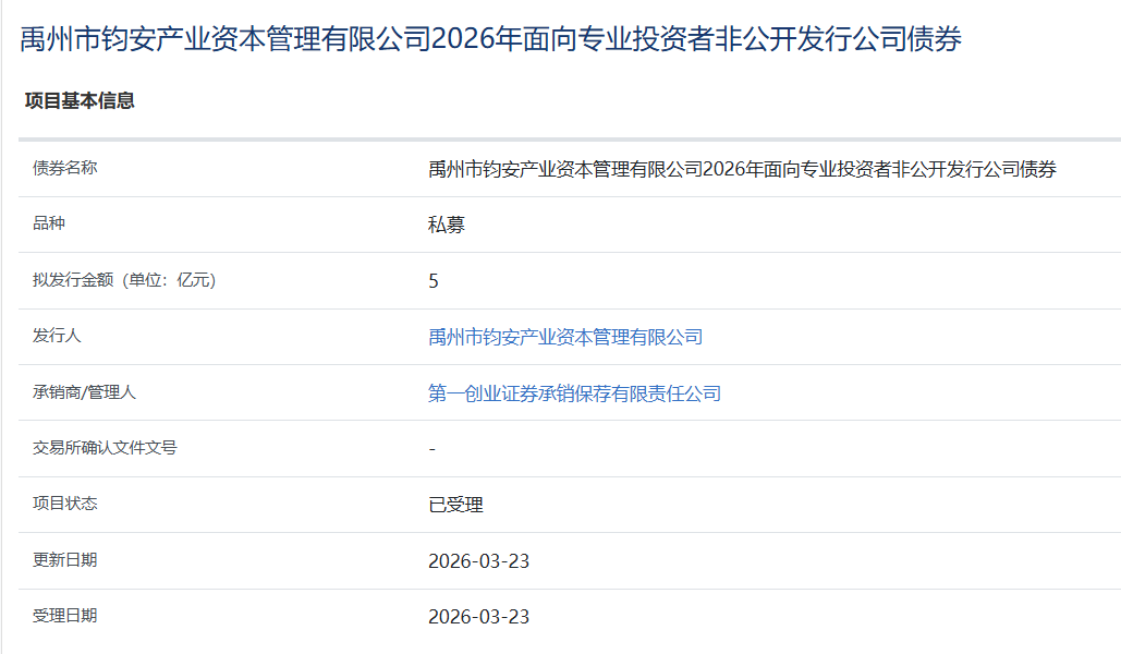 【大河财立方消息】3月23日,禹州市钧安产业资本管理有限公司2026年面向专业投资者非公开发行公司债券项目,获上交所受理。