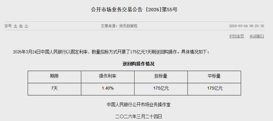 3月24日,中国人民银行发布公告称,2026年3月24日中国人民银行以固定利率、数量招标方式开展了175亿元7天期逆回购操作。
