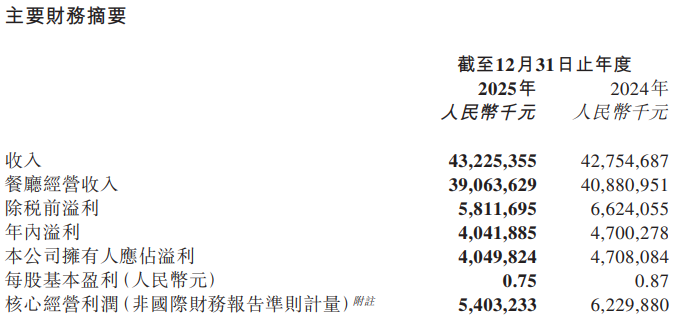 餐厅表现方面,2025年自营海底捞餐厅整体翻台率为3.9次/天,2024年为4.1次/天;全年共接待顾客3.84亿人次,较上年下降7.5%。